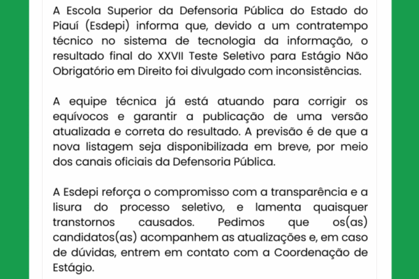 A Escola Superior da Defensoria Pública do Estado do Piauí (Esdepi) comunica que, devido a um problema técnico no sistema…