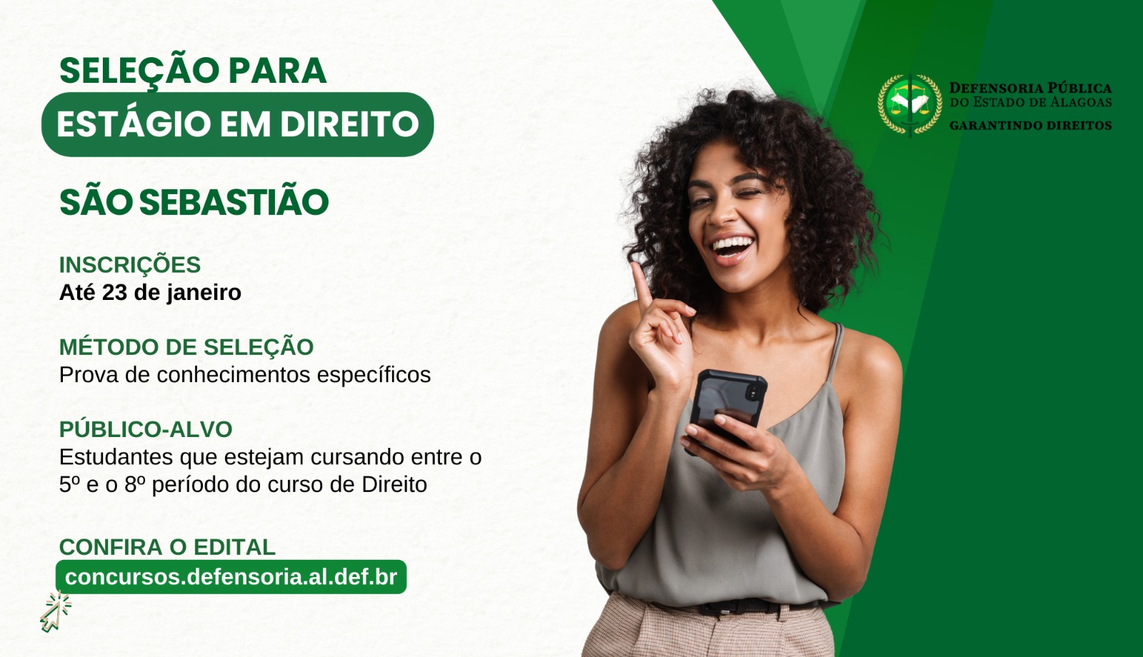 A Defensoria Pública do Estado de Alagoas (DPE/AL) está oferecendo uma oportunidade de estágio em Direito na cidade de São Sebastião. Os interessados podem se inscrever até o dia 23 de janeiro, por meio da plataforma designada para o processo seletivo.