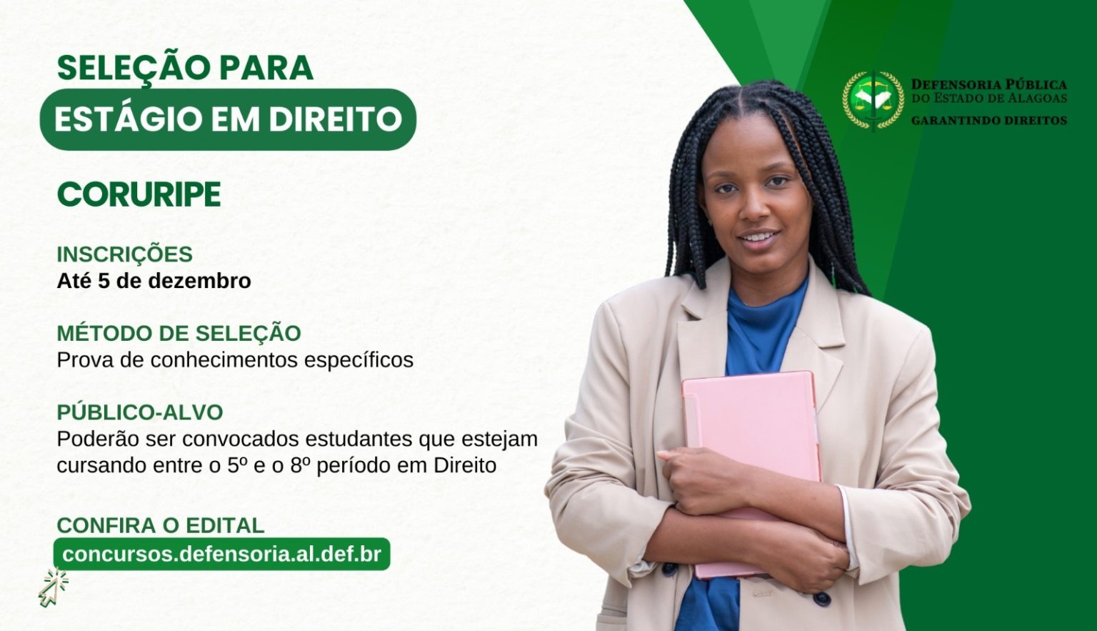 A Defensoria Pública do Estado de Alagoas (DPE/AL) está com inscrições abertas para um processo seletivo destinado a estagiários de Direito na cidade de Coruripe. Os interessados podem se inscrever até o dia 5 de dezembro, e devem realizar a inscrição exclusivamente através do site oficial da DPE/AL.