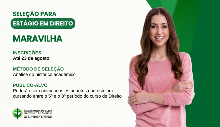 A Defensoria Pública do Estado de Alagoas (DPE/AL) está promovendo um processo seletivo para estágio em Direito na unidade de Maravilha. As inscrições estão abertas até o dia 23 de agosto e podem ser feitas inteiramente pela internet, no site oficial (concursos.defensoria.al.def.br).