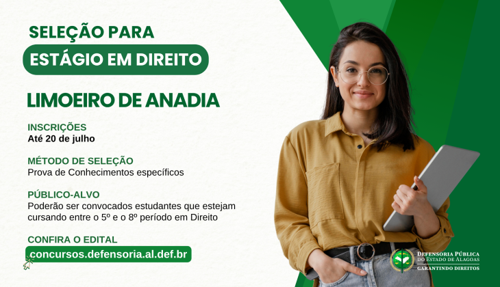 Estão abertas as inscrições para o processo seletivo de estágio em Direito na Defensoria Pública do Estado de Alagoas (DPE/AL), localizado em Limoeiro de Anadia. Os estudantes interessados têm até o dia 20 de julho para se inscrever pelo site oficial da Defensoria.