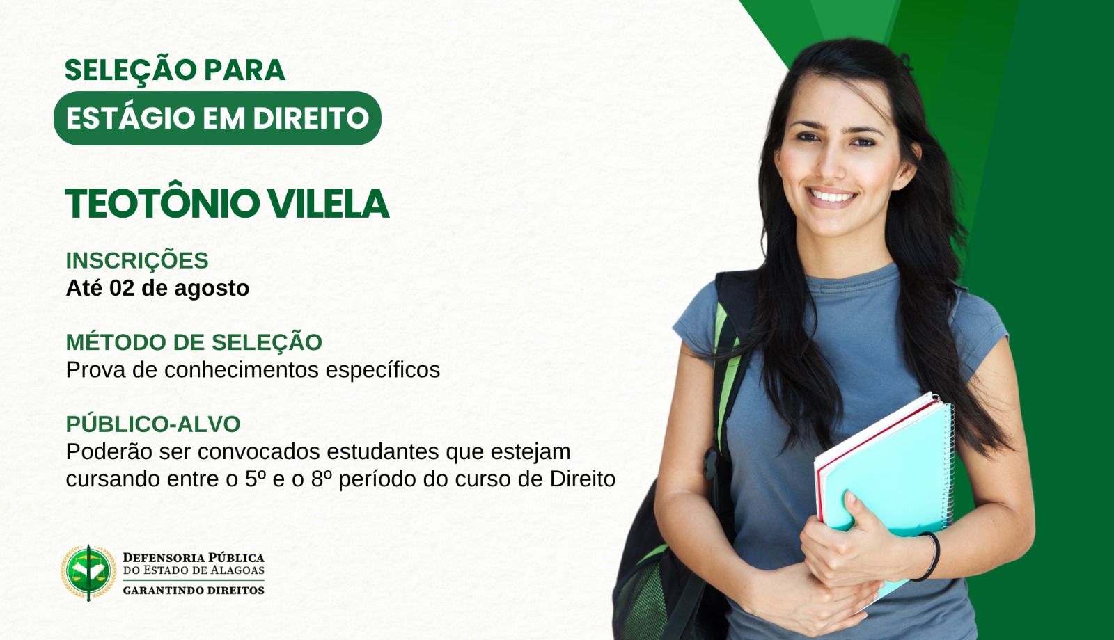 Os estudantes de Direito têm uma ótima oportunidade! Estão abertas as inscrições para o processo seletivo de estágio na Defensoria Pública do Estado de Alagoas (DPE/AL), especificamente na cidade de Teotônio Vilela. Os interessados devem realizar a inscrição até o dia 2 de agosto, acessando a plataforma disponível para o processo.