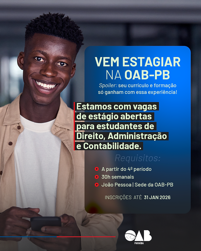 A Ordem dos Advogados do Brasil, Seccional Paraíba (OAB-PB), está com inscrições abertas para um processo seletivo de estágio voltado a estudantes dos cursos de Direito, Administração e Contabilidade. As vagas disponíveis são para atuação na sede da OAB-PB, localizada em João Pessoa, com carga horária semanal de 30 horas.