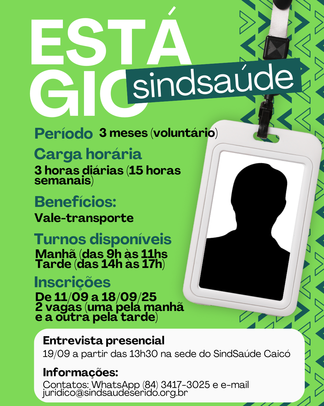 O Sindsaúde Regional do Seridó anunciou a abertura de inscrições para duas vagas de estágio voluntário na área de Direito do Trabalho. As atividades ocorrerão no escritório da entidade em Caicó/RN.